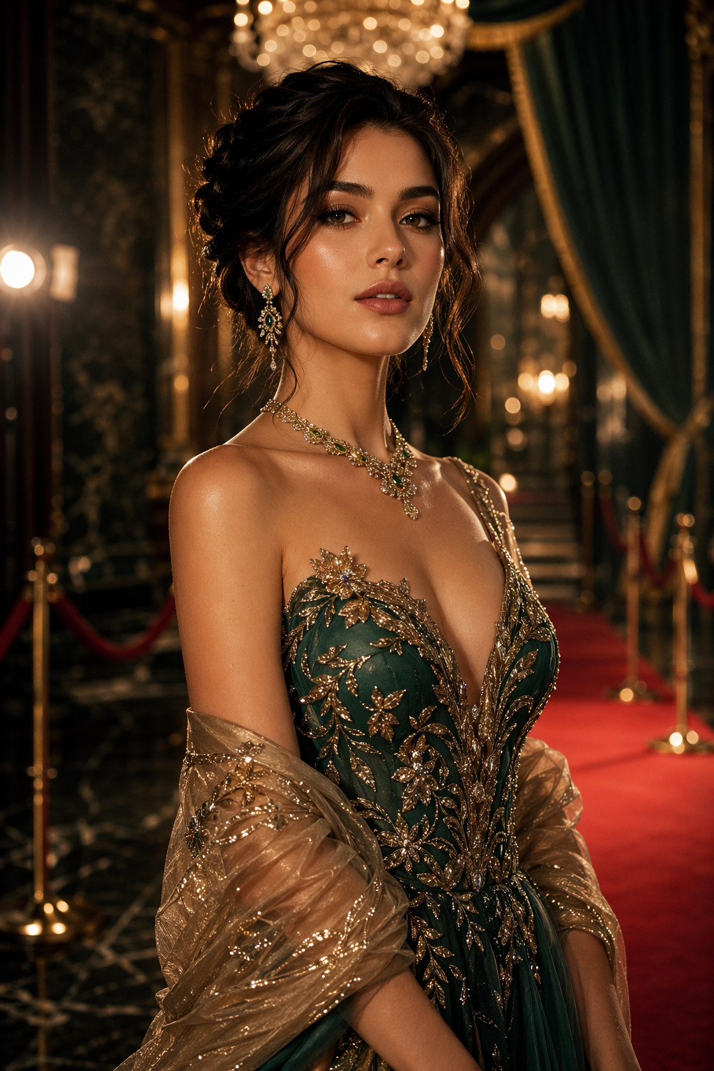 Use this direction when you want a refined celebrity-style portrait with elegant wardrobe, premium event lighting, and a more aspirational finish.