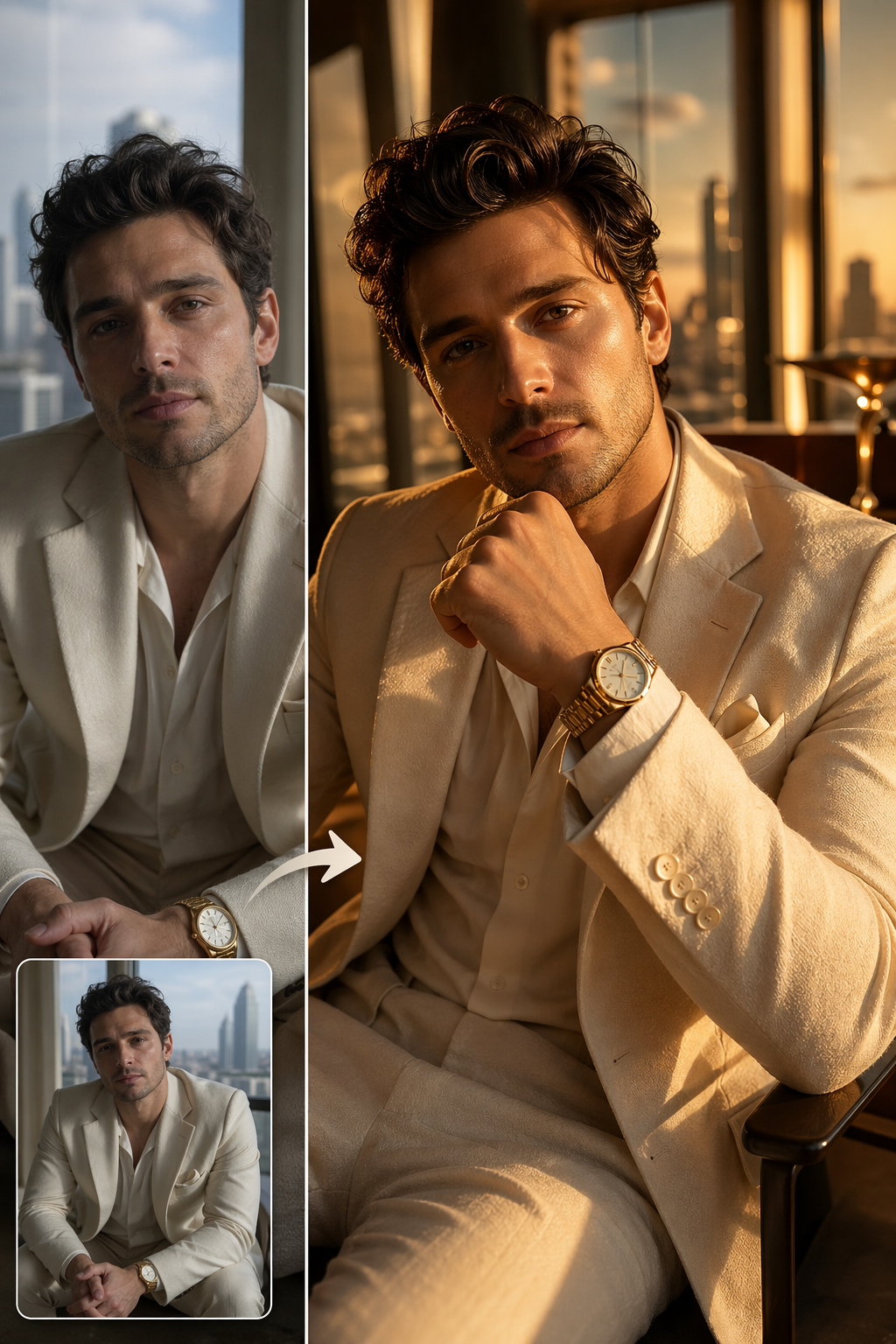 Useful when a source photo needs warmer light, better styling, a sharper setting, or a more premium business portrait.