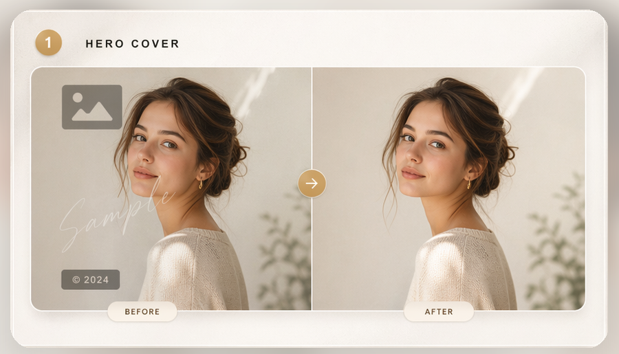 AI Watermark Remover — Upload a photo and remove watermarks, logos, stickers, and timestamps with AI cleanup that keeps texture, edges, and lighting intact.