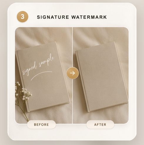 Clean away signature text, proofing marks, or embedded caption overlays without flattening the nearby detail.